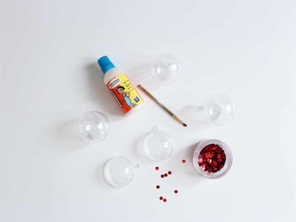 Cette boule de Noël à pois est très simple à réaliser ! Il suffit de plonger le pinceau dans la colle liquide et de déposer de la matière sur chaque confetti. Sans attendre, dispersez-les sur la boule transparente et attendez que la colle sèche.