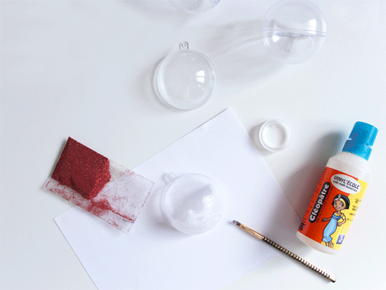 Pour créer des boules de Noël paillettées, rien de plus simple ! Commencez par badigeonner votre boule transparente de colle liquide. Ensuite, avec le pinceau, dessinez une base ondulée que vous remplirez entièrement de colle. Pensez à le faire sur du papier que vous pourrez jeter par la suite, pour ne pas abîmer votre table.